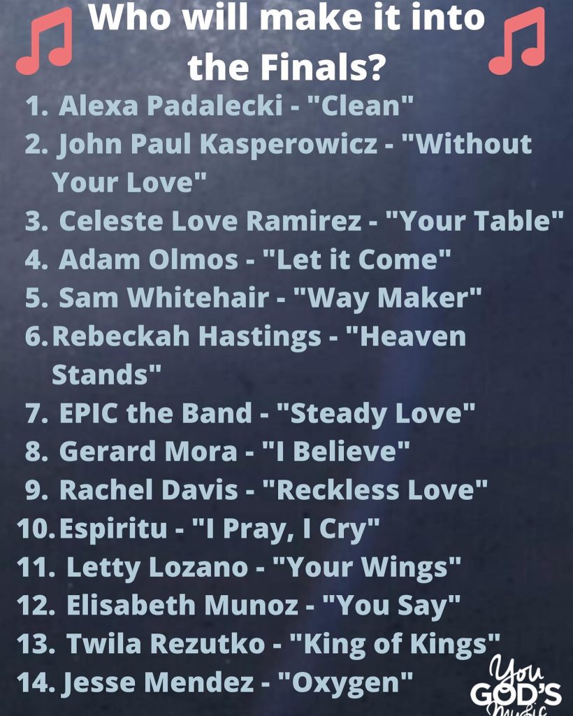 Read More50% of the artists score will come from the general public and the other 50% will come from our three judges; Jordan Feliz, Caitie Hurst and Mason Shirley.Only the top 5 artists will move onto the finals!!✝️